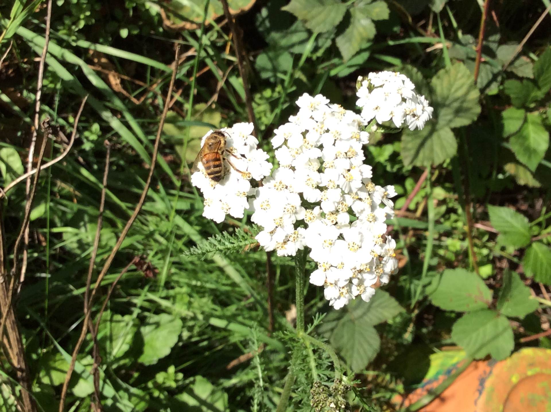 Mr Gardner brought us a bee that a pupil in Year 2 had seen and rescued from the playground. We found a flower in our little wildflower patch, to place it on; it started drinking nectar straight away and then, revitalised, flew off!