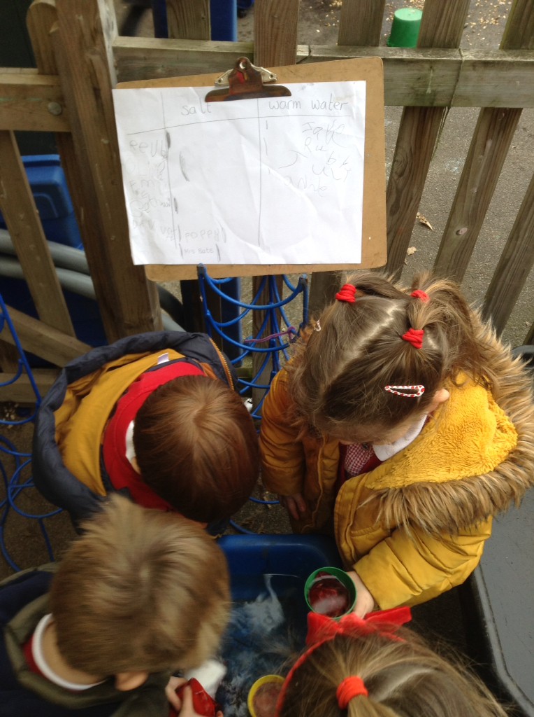 Penguins have been making frozen nature at their mud kitchen this week and have been investigating different ways to melt their concoctions. The children have also been asking each other to make predictions on what will speed up the melting process - warm water or salt? They collected their results in a tally chart.